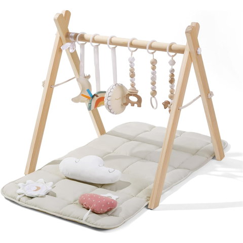 Gimnasio de madera para bebés 202412 con 9 juguetes sensoriales, Juego plegable para bebés, marco de gimnasia, Centro de Actividades, juguetes Montessori de madera de pino Natural