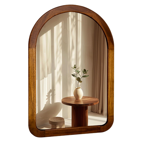 202412 miroir trempé rustique en bois marron avec arc d'angle rond en bois ferme miroir en bois pour salle de bain