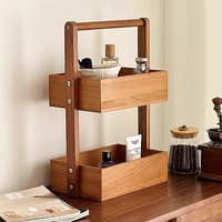 ชั้นเก็บของไม้ไผ่สองชั้นชั้นที่จัดระเบียบเครื่องสำอางในห้องนั่งเล่น